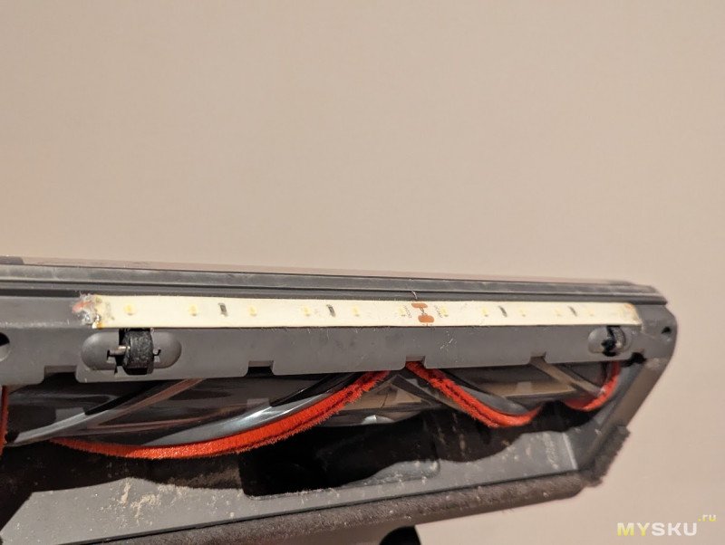 Протер спиртом щетку пылесоса и место для скотча. Приклеил подсветку на комплектный кусочек скотча. Лучше приклеивать когда эта штука включена, чтоб видеть, насколько далеко она должна быть выдвинута.