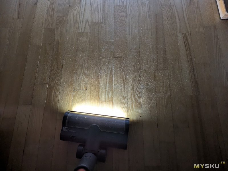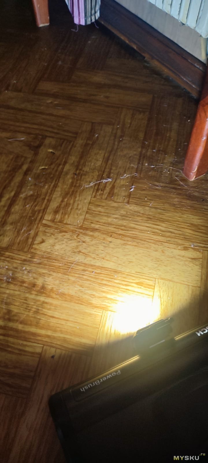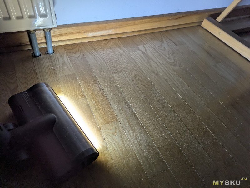 Но все же с этой штукой грязь лучше видно в темноте. Недостаток в том, что эта подсветка иногда выключается, если задеваю щеткой пылесоса с подсветкой за кнопку включения. Но она так же легко включается, если нажать щеткой с этим фонариком на какую-то поверхность. Пылесосить стало интереснее, поиск мусора и пыли превратился в квест, игру. Ну и его стало лучше видно.