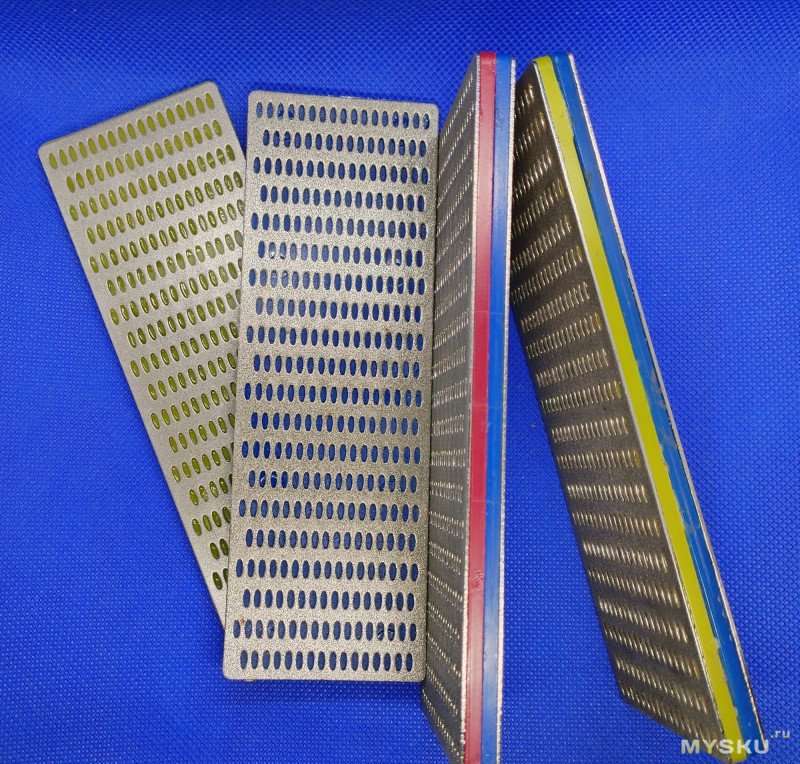— иногда грубую обдирку делаю двумя склеенными Зубровскими брусками Р200 и Р400. Размер их 50х100мм.Толщина в сумме дает 8,5мм как у алмазных гальванических бланков на пластиковой основе. У Веневских двухсторонних бланков 10мм. У них достаточно широкое поле для формирования геометрии первоначальной плоскости подводов и заусенца;
