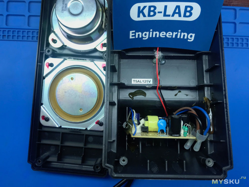 А колонки — стандартный как лист А4 дешман, но бывает вариант ещё проще, с усилителем и регулятором громкости на проводе, так экономят на пресс-формах и сборке, обе колонки получаются идентичные.