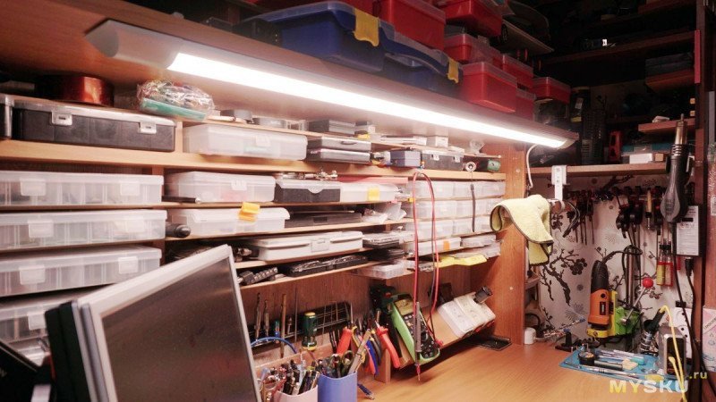 Года три назад, на кромку полки над столом подвесил линейный светильник. Сначала это была газоразрядная лампа T8 длинной чуть больше метра, потом поменял на светодиодный, обычный, с токовым драйвером.