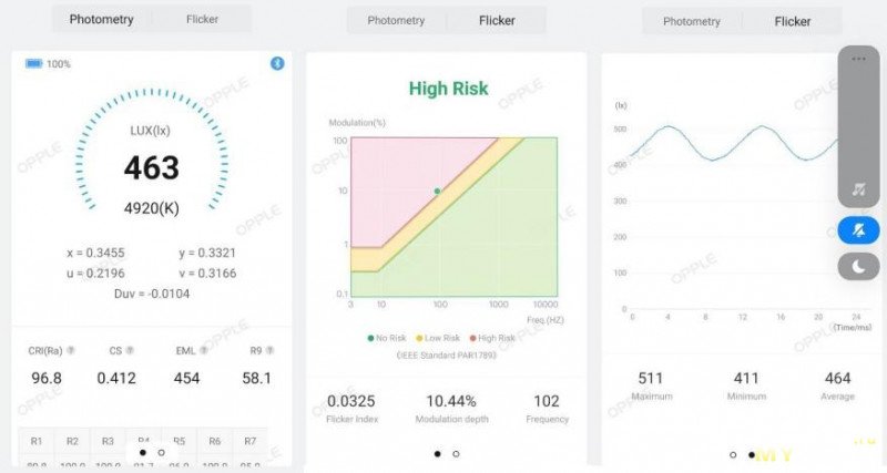 Cri 96.8 это правильно. Но вот r9 тоже должен быть ближе к 100%. Температура свечения 4920k, а должна быть 2700к. Лампа накаливания это образец идеального источника света после 18:00 вечера, чтобы циаркадный ритм работал, как швейцарские часы. У вас наверно паразитная засветка от окна, хотя по осциллограмме пульсаций её не видно, в общем мистика.