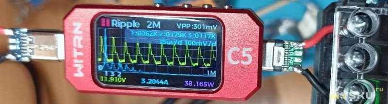 Подключил блок питания. Без нагрузки выдает ровно 12.0 В. Под нагрузкой ~40Вт (3.35А) получилось — 11.78В. Пульсации при этом ~300 мВ.