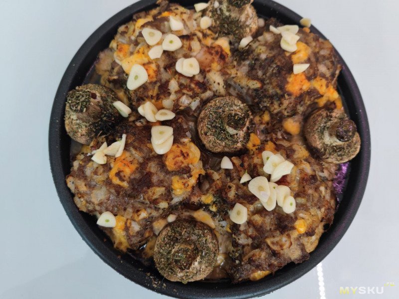 На сковородке температуры оказалось многовато, а регулировки нет, поэтому индейка дала много сока и была накрыта крышкой, после выпаривания лишней жидкости придаем колер уже без крышки, в итоге получаем вареную, зарумяненную индейку. В целом получилось вкусно, но претендовать на полноценный гриль этот прибор не может. Банальный контроль температуры в процессе работы программы невозможен, поэтому здесь не зачет.