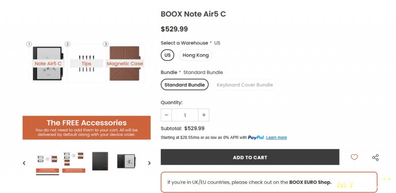 Планшет и чехол к нему продаются по отдельности. Находятся в двух разных упаковках. В комплекте первого есть стилус Boox Pen 3, кабель USB-A USB-C, толкатель лотка карты памяти и инструкция с буклетом МакЦентра.