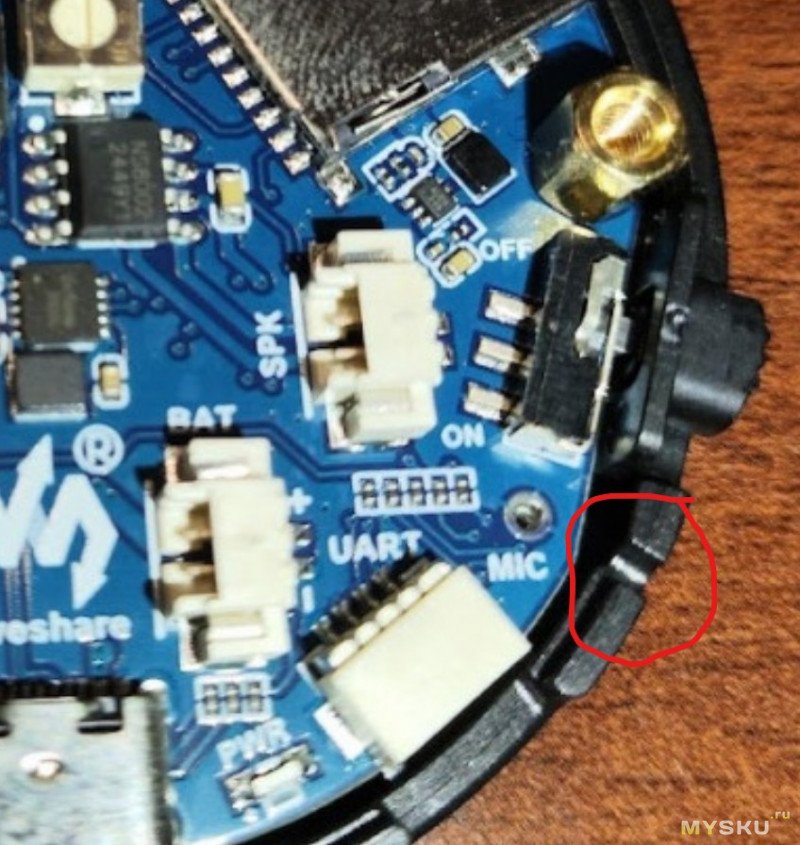 Выполнено аккуратно, UART и SPI выведены в разъёмы, есть слот под карту памяти(с аутентичным китайским отпечатком). Становится понятно, что боковые кнопки — это стандартные для всех девкитов BOOT и RST. Тумблер включения кстати просто разрывает линию от аккумулятора, при подключении к USB железка включается вне зависимости от его положения.Из интересного — зоркий глаз может заметить некий разъём RTC — он нужен для подключения батарейки для питания RTC чипа (PCF85063). Вероятно, в каких-то задачах может пригодиться.
