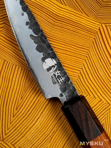 Сталь понравилась, похожая на Самуру. Термообработка в анонсированном диапазоне чувствуется 56-58 HRC (заявлено 56+ HRC), что на кухне для такого типа и исполнения совсем неплохо.