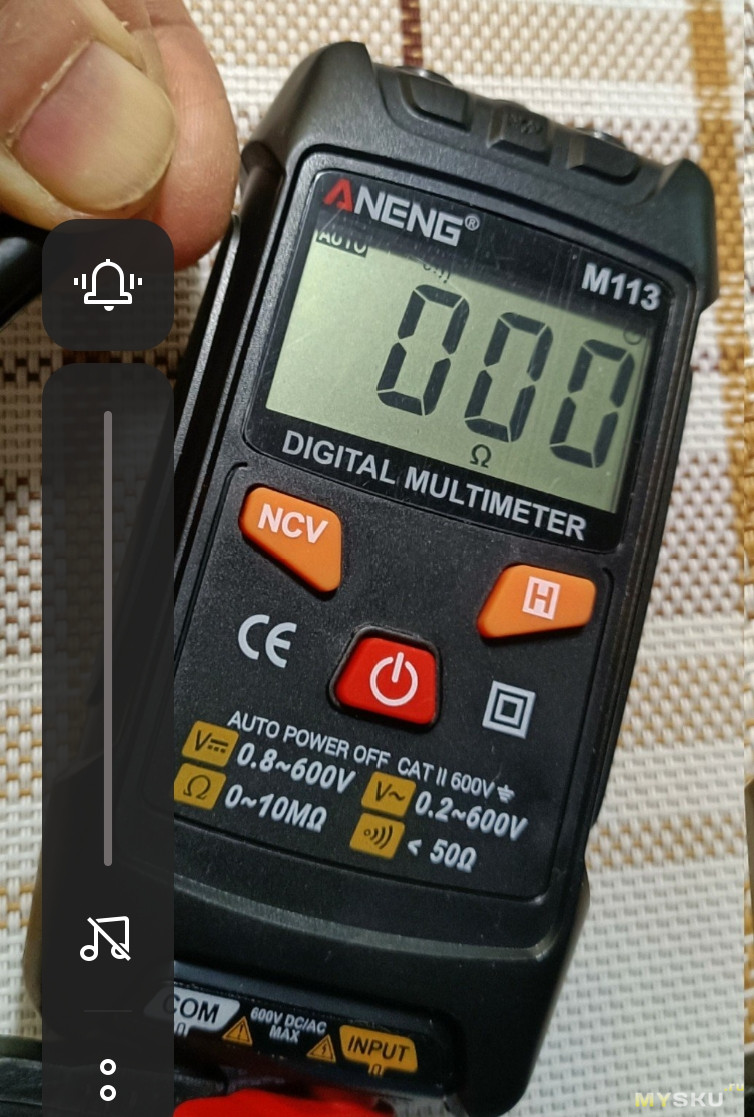 Умеет: прозванивать (с короткой паузой); измерять сопротивление; напряжения; искать проводку (видимо и место обрыва); скрытый функционал — определение фазы (на экране liUE — live), но у меня получилось лишь стоя на бетонному полу (9V «утечки»), на деревянном не получается (2,5V) — при этом нужно один щуп держать рукой, плюс нажимать кнопку NVC, вторым искать фазу/ноль. Но можно просто щупом при нажатой кнопке различить в розетке, например, где и что есть.