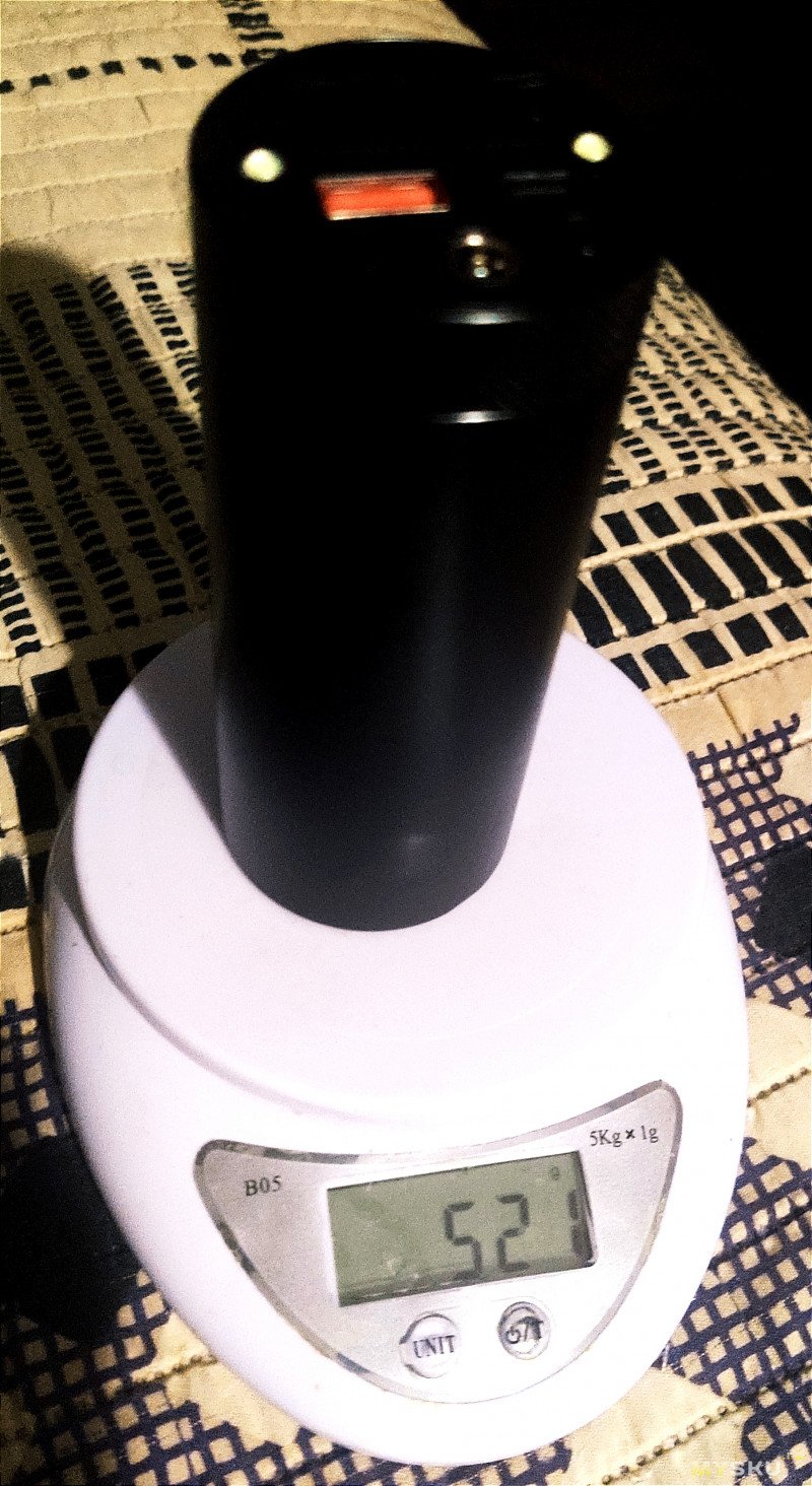 Хочется отметить качественно изготовленный корпус, металлический, окрашенный (у меня черный). Похож на тубус для опечатывания ключей. Цилиндрический стакан под аккумулятор и «крышка» с накаткой и резьбой для закручивания на стакане.