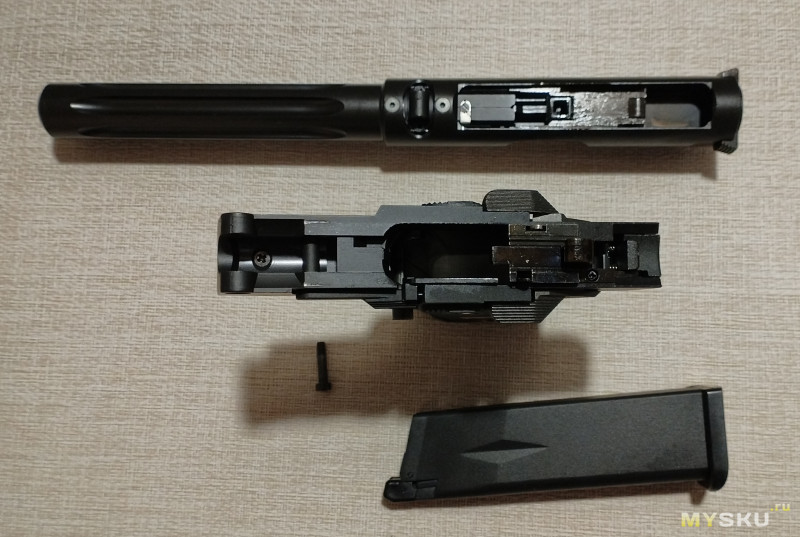 Внутри пистолета расположен регулируемый хоп-ап.Для неполной разборки пистолета потребуется торцевая бита.