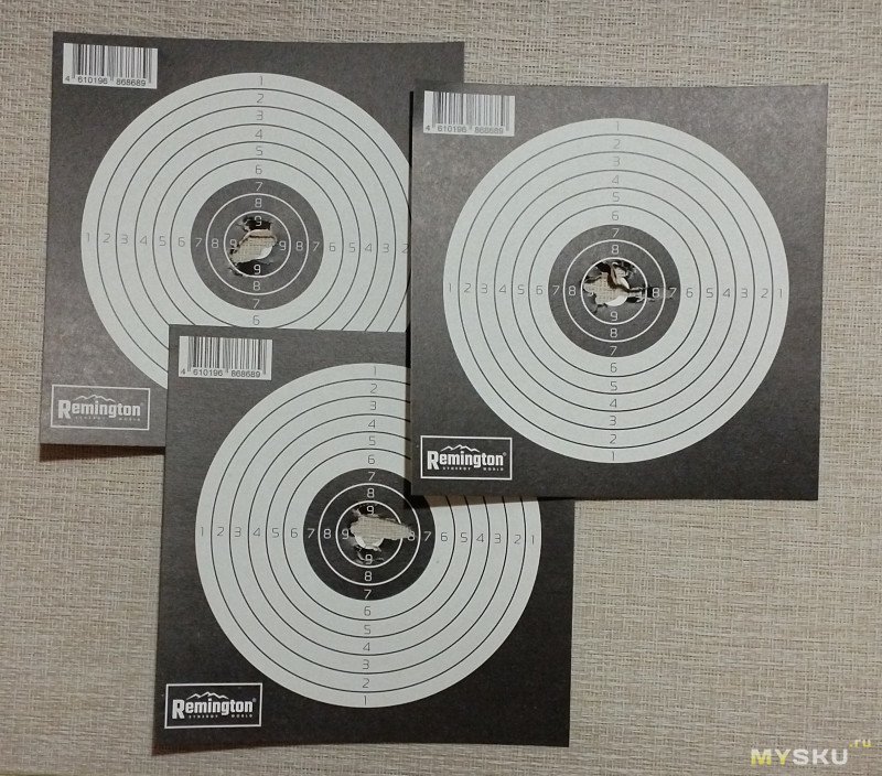 При работе над выстрелом на такой дистанции все пробоины могут уложиться в одну точку. Здесь результат чуть лучше