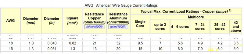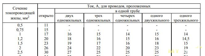 В верхней указано, что одиночный провод (я так понимаю, медь это относится к меди) 0,82 мм. кв. — выдерживает ток (максимальный) 9,5 А.