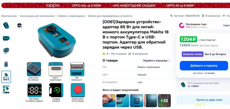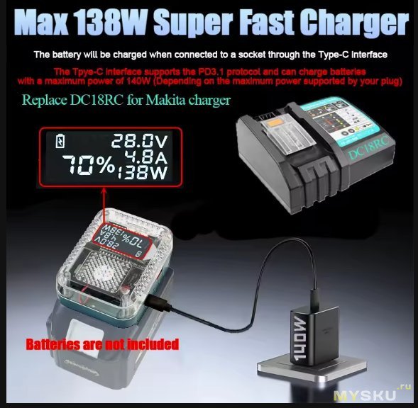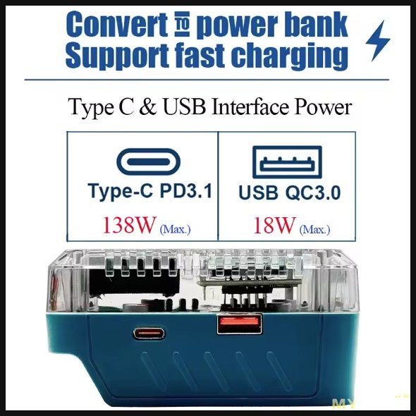 Наконец пришло. Упаковка как аккумулятор для теслы. Вес под 2 кг. Ну, думаю, сорвал джек. Руки, ноги и хвост чешутся. Так и хочется разломать. Посмотрел актуальную цену — уже дешевле. Никакого клея и защёлок. Винты для разборки — шестигранник. Вот тут у меня случился армагедон. Оказывается тут присутствует стандартный разъём зарядки 5.5 на 2.1. Офигеть. Зачем? Оказывается юсб здесь чисто декоративный. На юсб А 9 вольт! На тип с 5 вольт 150 мА. Реально при подключении кабеля с индикацией — 2.9 вольт! Зачем? В общем я слегка удивлён. Ладно, фиг с ним с пауэрбанком. А как в основном предназначении? Поставил на разряд фонарь www.ozon.ru/product/fonar-dlya-akkumulyatorov-makita-14-4-18-v-svetodiodnyy-rabochiy-s-2-porta-usb-dlya-zaryadki-s-2179888553/. После разрядки буду заряжать. Итого фонарь проработал порядка 7 часов. Очень приличный результат, так как жрать он должен порядка 2х ампер. Температура в верней части фонаря на глаз (палец) достаточно высокая. Думал будет гораздо хуже. Дальше, как и положено — фото