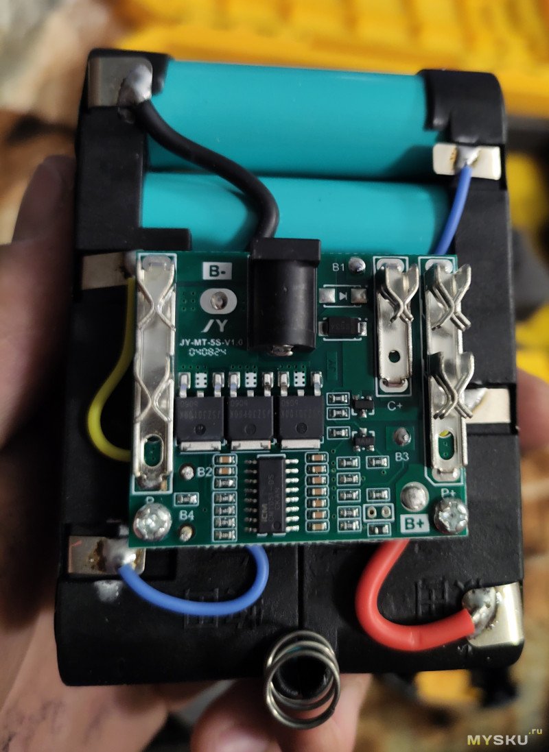 Разобрал АКБ посмотреть, что тут есть. Стало понятно, что 2 Ач, которые заявлены описании товара, в аккумуляторах нет. Стоят самые дешевые ячейки в АКБ. Пайка в бмс плате ужасна, пара непропаянных проводов это видимо норма.