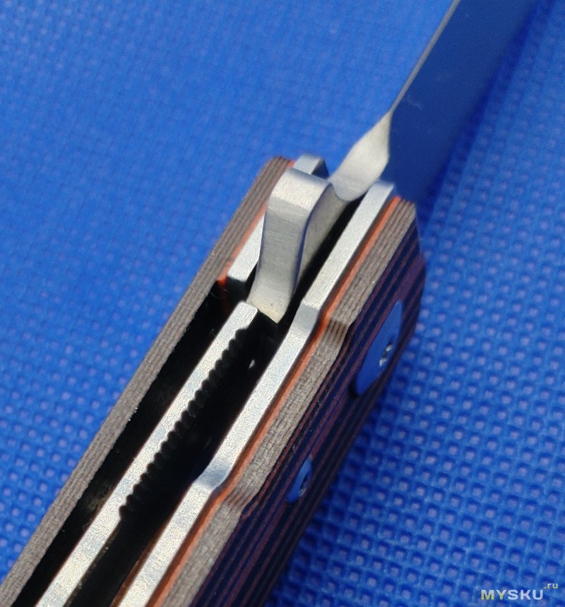 Открытие клинка за флиппер четко, уверенно и мягко. Клинок надежно встает на замок лайнера. В открытом состоянии плавник флиппера хорошо выполняет роль упора для руки.