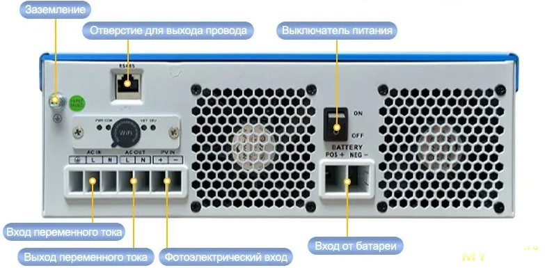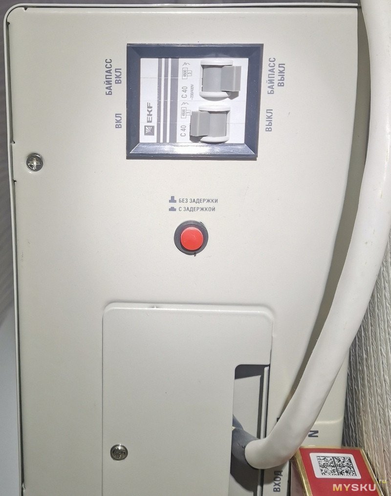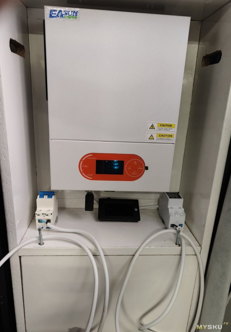 Кстати, выключить его не так то просто: если просто выключить выключатель, инвертор перестанет заряжать аккумулятор, но экран не погаснет и вентиляторы не отключатся. Полностью выключается он только при выключенном выключателе и отсутствии напряжения сети на входе.