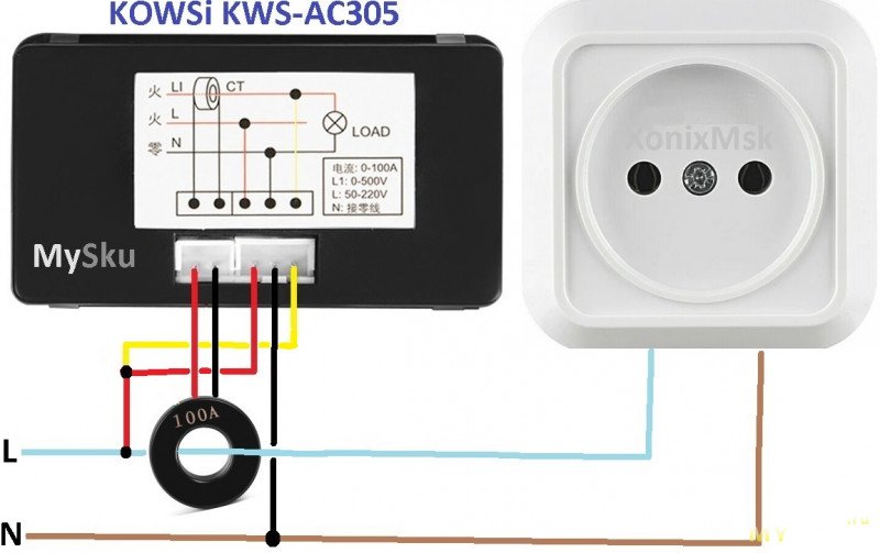 KOWSi KWS-AC305 - многофункциональный индикатор параметров переменной сети (до 300V) и характеристик подключаемых приборов (до 100А)