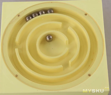 Другая подобного типа игрушка, что я видел — картонная коробочка, закрытая сверху стеклом, внутри несколько бумажных «автобусов» длиной пару сантиметров, с шариком от подшипника внутри — нужно было их расставить по ячейкам, наклоняя коробочку.