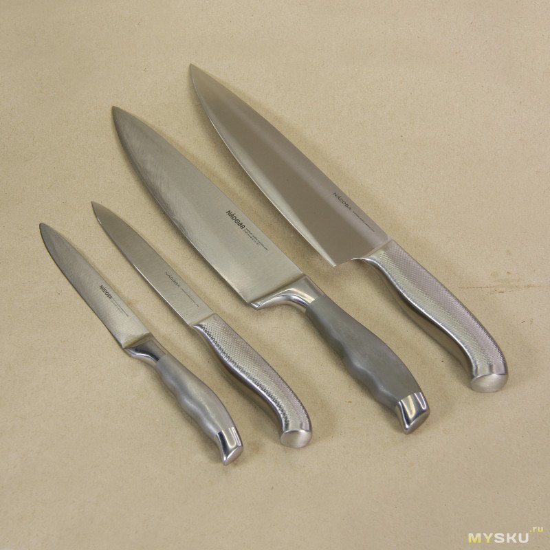 Вполне практичный набор, не особо дорогой (если учитывать подставку/точилку/ножницы), так что подобные ножи имеет смысл держать под рукой на кухне, на случай «большой готовки». Нержавейка приличная по качеству, по желанию можно подточить при получении. В плюсах — ручка не боится высоких температур, да и в целом материал стойкий и к ржавчине, и к соли/лимонному соку. Не рекомендую пользоваться такими ножами по стеклянным разделочным доскам или по тарелкам. Используйте хорошую торцевую доску. Ну и содержите ножи в чистоте. Всем добра!