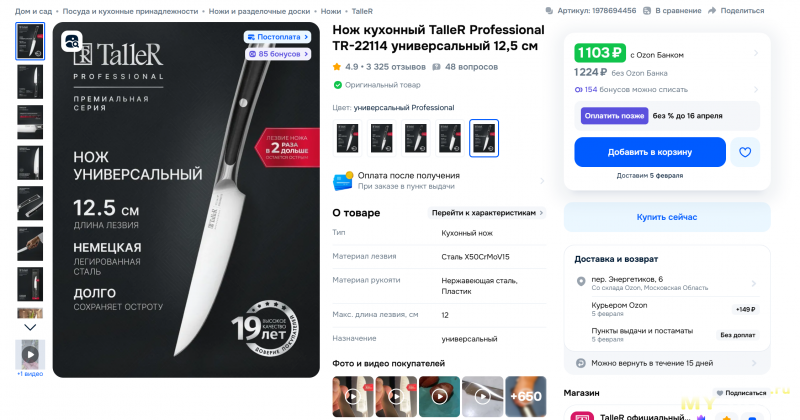 По доставке все стандартно — заказывал на Озоне из наличия в РФ. Прислали за пару-тройку дней. Упаковка – картон с нанесенной информацией о ножах и бренде, небольшим списком характеристик на обороте. Сам набор совсем недорогой – сейчас он стоит 2 730 рублей и это с учетом ножниц, буковой подставки и точилки.
