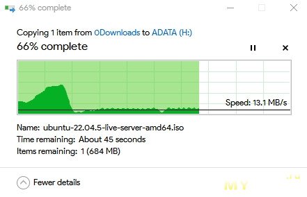 При копировании данных (установочные дистрибутивы) на нашу флешку ADATA UV320 через проводник Windows скорость не скакала и четко держалась на уровень ≈40-42 МБ/с. Это хорошо. Ровно такое же поведение мы видели в тесте на линейную запись.
