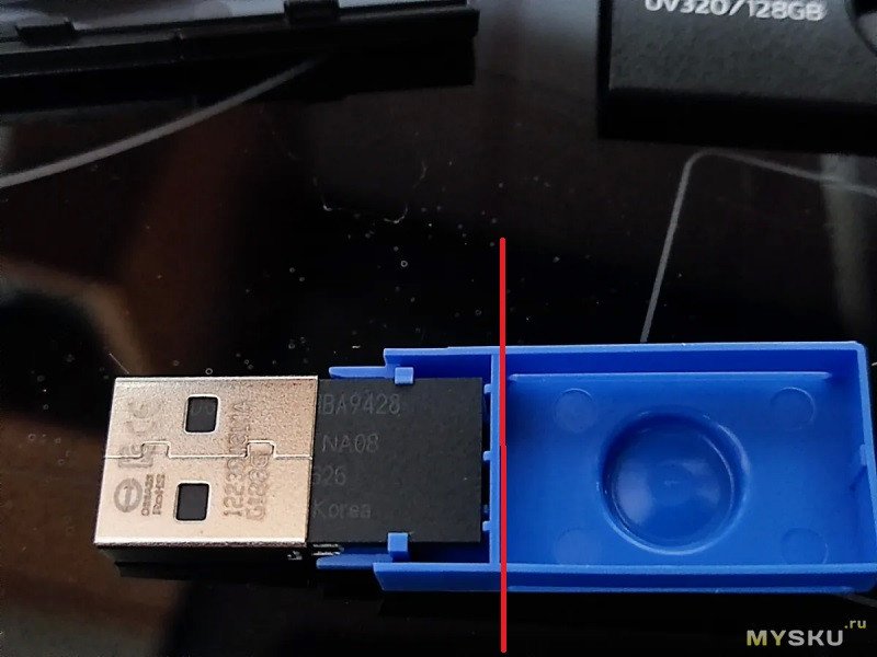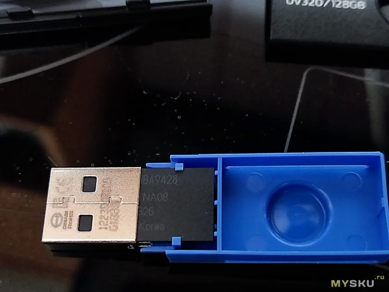 Сам USB-коннектор стандартный металлический. Внутри мы видим вставку синего цвета, что по стандарту цветовой маркировки соответствует интерфейсу USB 3.0 (или, как его сейчас называют, USB 3.2 Gen 1).