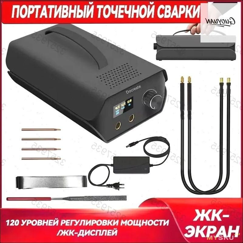 В комплект, помимо самого сварочного аппарата и медных сварочных электродов, входит педаль управления, зарядный кабель USB A-C, наждачная бумага, никелевая лента, а также две запасные стержневые вставки для электродов.