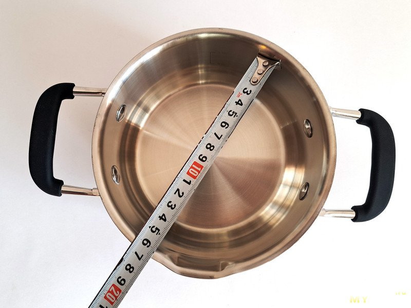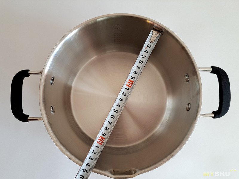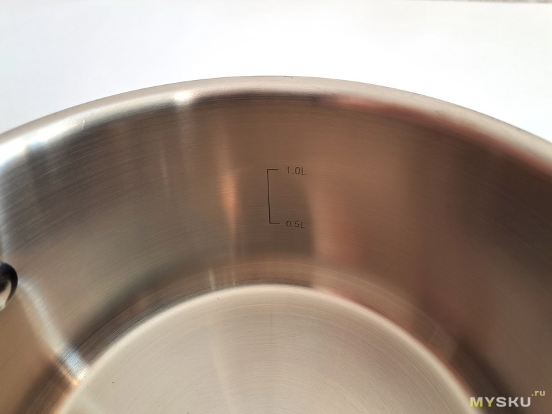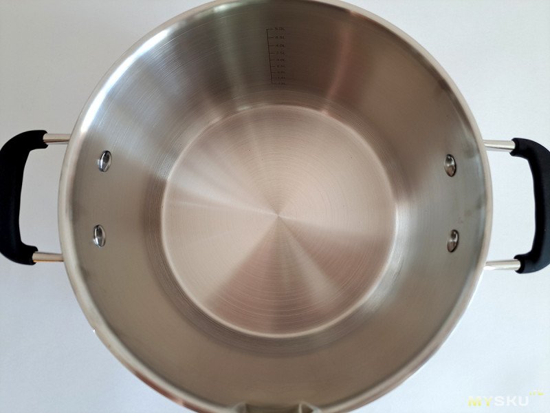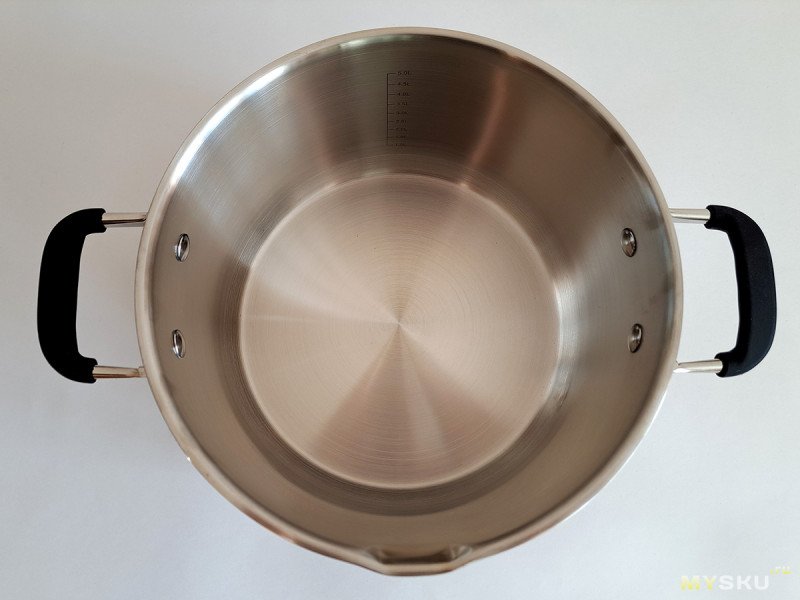 Напомню, что по ГОСТу, объем кастрюль указывается при заполнении жидкостью до самых краев. В свое время, я прочитал многие сотни отзывов про кастрюли на маркетплейсах, где люди этого не знают и возмущаются, что получили кастрюли меньше, чем заявлено. Тут же производитель отсыпал объема с запасом: у пятилитровой кастрюли на этой отметке заканчивается шкала с делениями (по заявке, могу измерить объём кастрюли до краев, но смысла в этом не вижу, так как использовать при таком заполнении не рекомендуется)