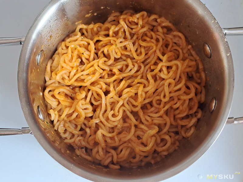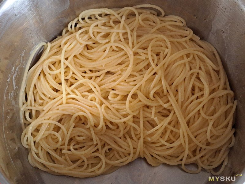 Спагетти готовы, сливаем воду через крышку без всякого дуршлага. Удобно.