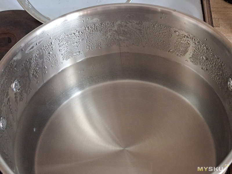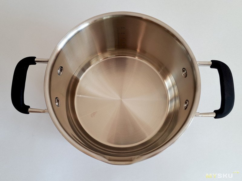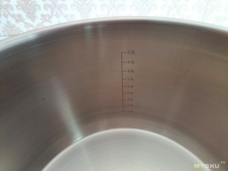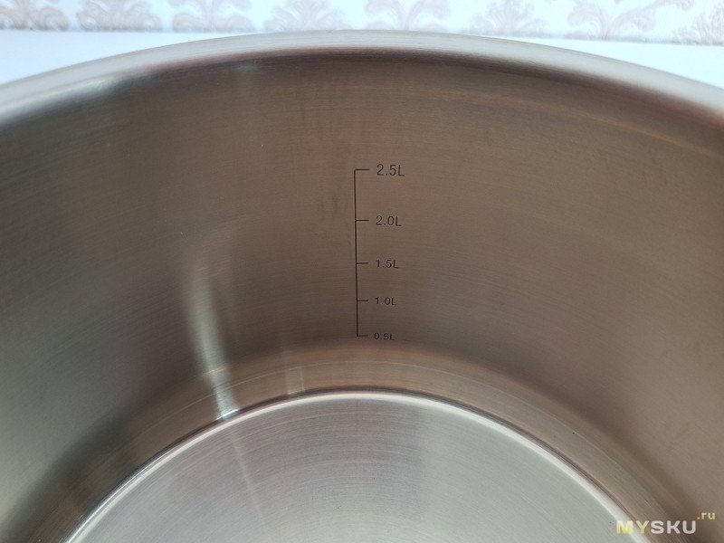 И хотя в описании заявлен объем 3 л, внутренняя шкала до 2,5 л. Конечно, три литра сюда влезут без проблем, заметно отклонение от тренда большой кастрюли.