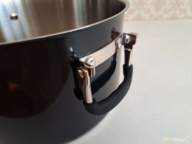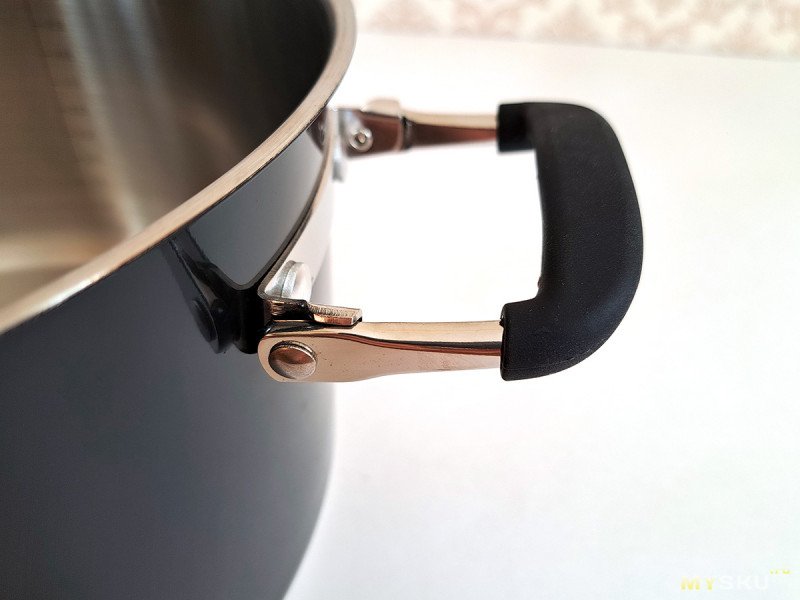 Складные ручки на кастрюле крепятся к массивному основанию на заклепках. Ход при складывании мягкий, люфта нет.