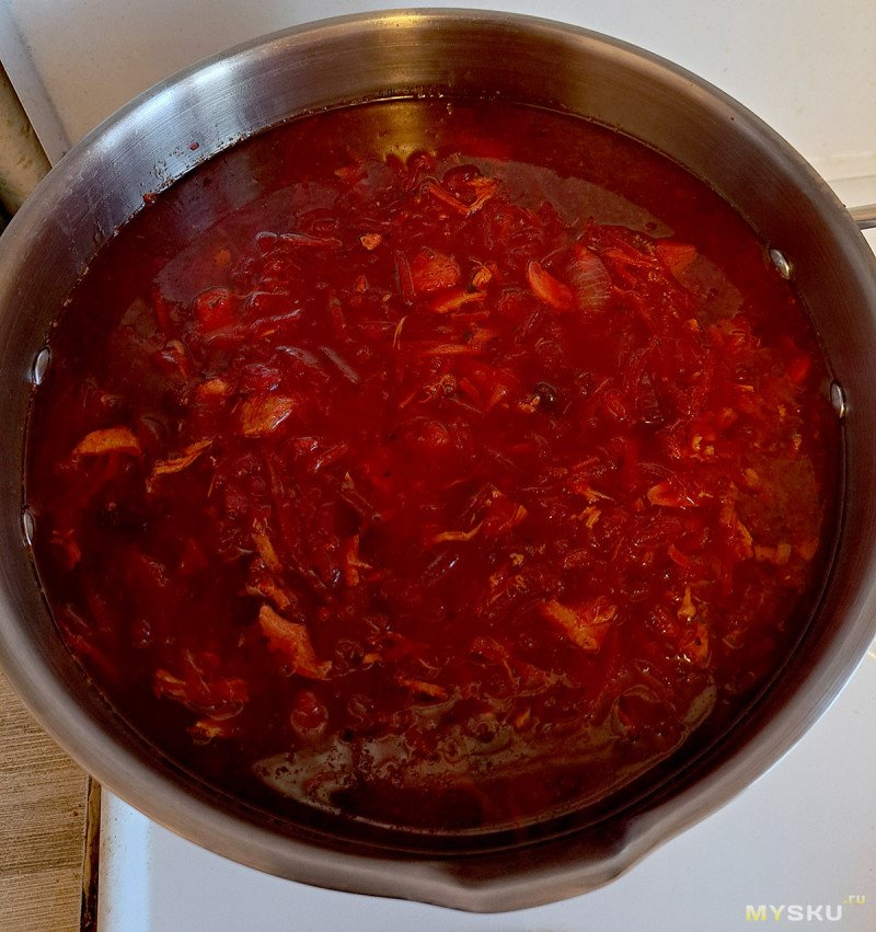Кастрюля с борщом простояла в холодильнике три дня и тут настал момент проверить одну из самых важных характеристик, современных нержавеющих кастрюль. Так как, судя по отзывам, многие из них – ржавеют. Конечно, не хлопьями как черная сталь, но нередко бывают пятнышки коррозии.