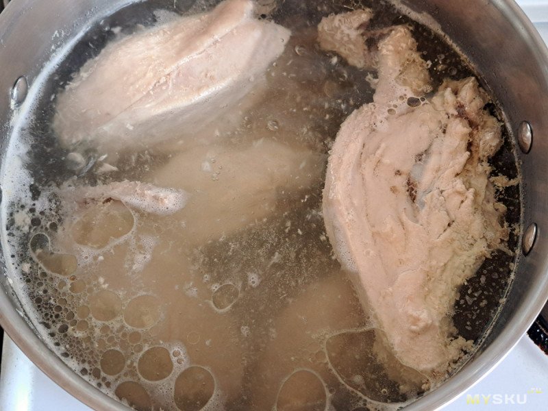 Закидываем в прохладную воду две куриных грудки. И варим до готовности периодически снимая пену. Затем вынимаем курятину, удаляем кости, мясо нарезаем кусочками.