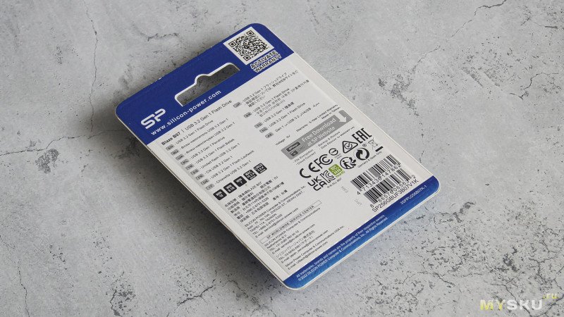 На оборотной стороне блистера размещена служебная информация на нескольких языках, QR-код для регистрации продукта и упоминание о 5-летней ограниченной гарантии. Также здесь указано, что накопитель оснащен антибактериальным покрытием.