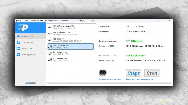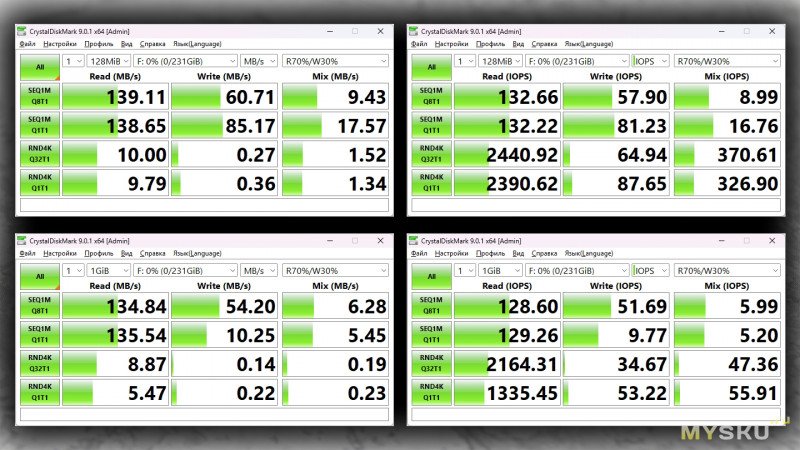 Синтетические бенчмарки рисуют довольно приличную картину. Последовательные чтение/запись на уровне ≈135/60 МБ/с, что выглядит очень красиво.
