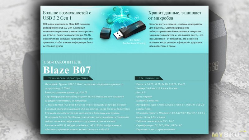 Производитель заявляет поддержку современного интерфейса USB 3.2 Gen 1, который обеспечивает теоретическую пропускную способность до 5 Гбит/с (на самом деле для пользователя это мало что значит). Накопитель доступен в объемах от 16 до 256 ГБ, а его габариты составляют 54,6 x 18,9 x 10,4 мм при весе всего 7,9 грамма. Корпус выполнен из пластика с антибактериальным покрытием, прошедшим лабораторные испытания. Ну, во всяком случае так заявляет производитель, а кто мы такие чтобы ему не верить.
