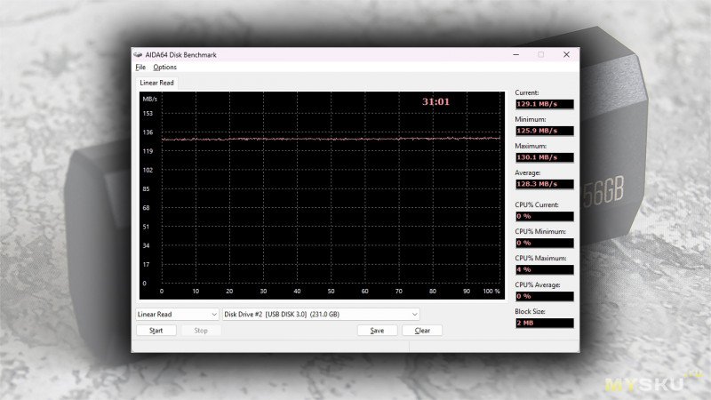 График линейного чтения выглядит значительно оптимистичнее – средняя скорость составляет около 125-130 МБ/с. Это хороший показатель, который позволяет комфортно работать с файлами, просматривать медиаконтент прямо с накопителя или быстро копировать данные на компьютер.