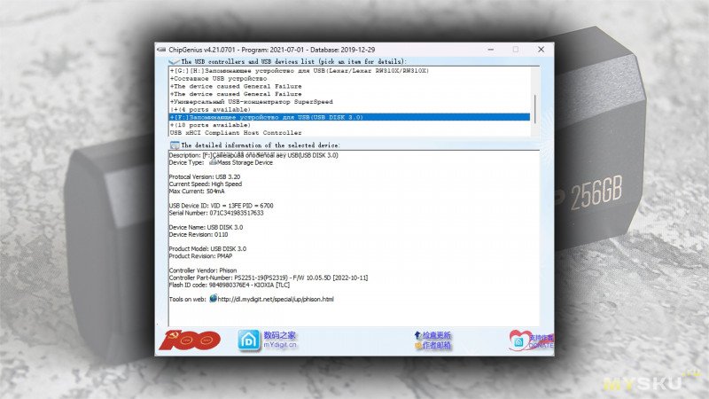 По данным утилиты ChipGenius в качестве контроллера здесь используется Phison PS2251-19 (PS2319) и TLC-память от Kioxia.