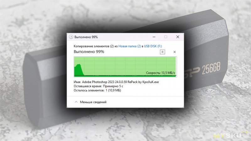 При копировании данных (установочные дистрибутивы, видеофайлы) на флешку через проводник Windows скорость держалась на уровне 10-14 МБ/с. Объем в 5,08 ГБ ГБ был записан приблизительно за 7 минут 51 секунду.