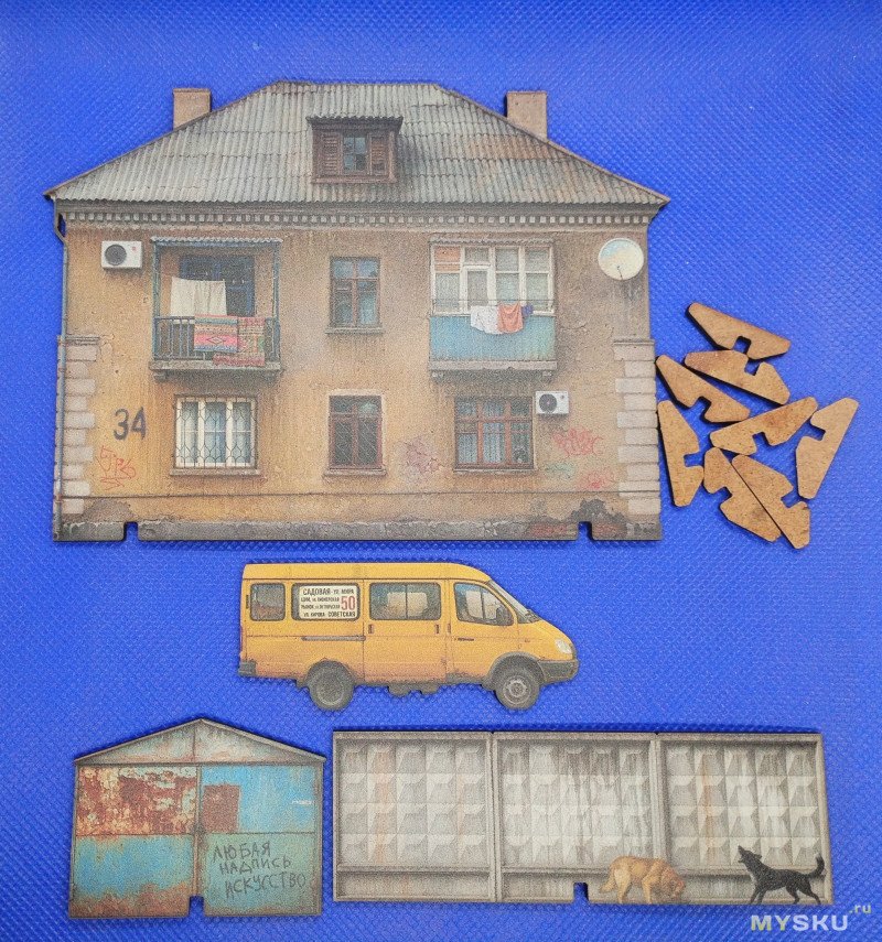 Материал — ХДФ (HDF — High Density Fiberboard) — древесно волокнистая плита высокой плотности, изготавливаемая методом сухого прессования измельченных древесных волокон при высокой температуре. Прочный и тонкий материал используемый в мебели (задние стенки), отделке и как основа для ламината. Сделано все четко и аккуратно.Все понятно. Не цепляло. Но вдруг обратил внимание на скромный набор. А вот домик мне показался знакомым. Вот и сработало то, на что рассчитывали авторы. Через некоторое время вернулся к картинке, а потом заказал на Озоне. Дом напомнил мне тот, в котором я родился. Именно таком двухэтажном, одно подъездном, на втором этаже с балкончиком в двухкомнатной квартире жили мои родственники, и я с бабушкой, дедушкой, с мамой и папой.