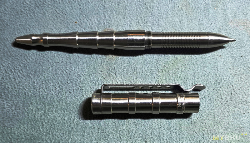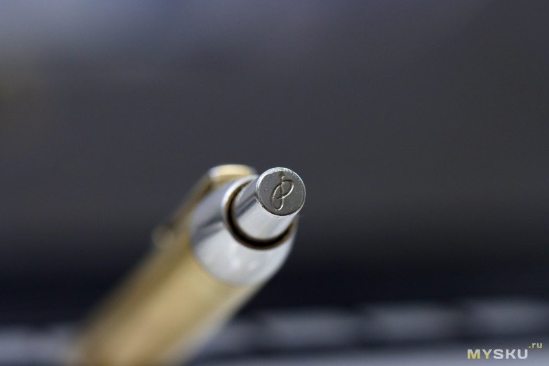 Торцы ручки обработаны на грубом камне, грани же, наконечник и прижимной механизм тщательно отполированы. На торце ручки — прижимной механизм, на одну из граней нанесено гравировкой название бренда.