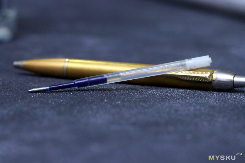 И оказывается, что у ручки минимальное количество деталей — корпус, пружинка, прижимной механизм и стержень. Формат стержней — Parker G2, я выбрал гелевый синего цвета (так что формально у меня не шариковая ручка, но гелевая).