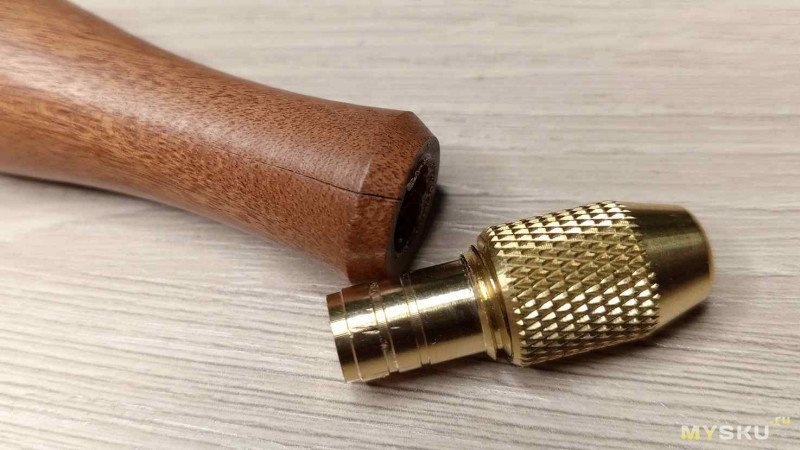 Отверстие в цанге 3.7 мм. Глубина отверстия 75 мм. Можно зажать инструмент с хвостовиком вплоть до 2.8 мм при сильном затягивании гайки цанги. Материал вроде как дерево, но ведет себя как пластик. Есть текстура и она не пропадает если материал срезать. Но при препарировании ножом срезается как пластик. Подозреваю, что по факту это дерево, обработанное смолой под вакуумом.Пока применение данным ручкам не нашел. Но на всякий случай пусть будут.