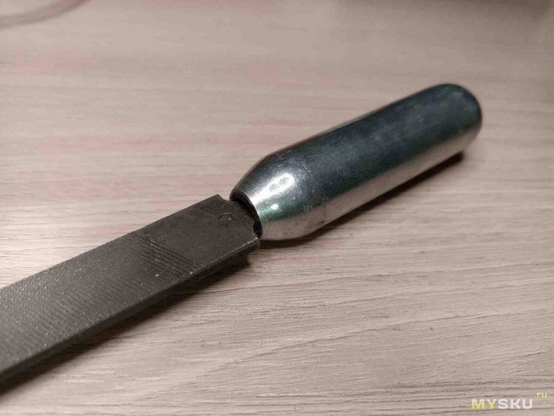 Но сама идея использовать баллон в качестве ручки — не очень хорошая. Работа надфилем это короткие движения вперёд-назад, и в начале каждого движения надфиль нужно разгонять, а в конце — тормозить. Массивная ручка сделает этот процесс утомительным.